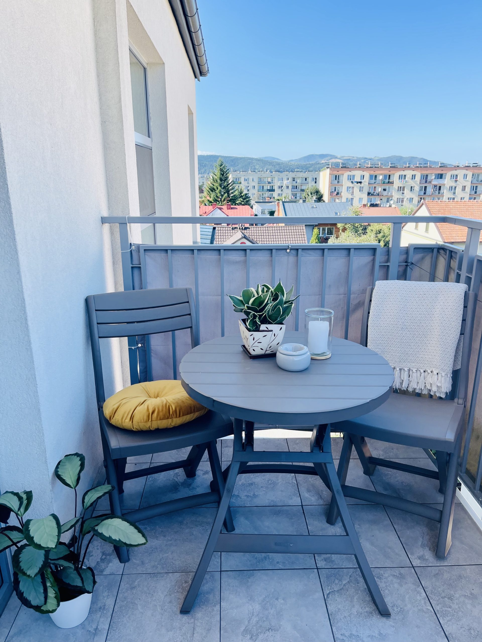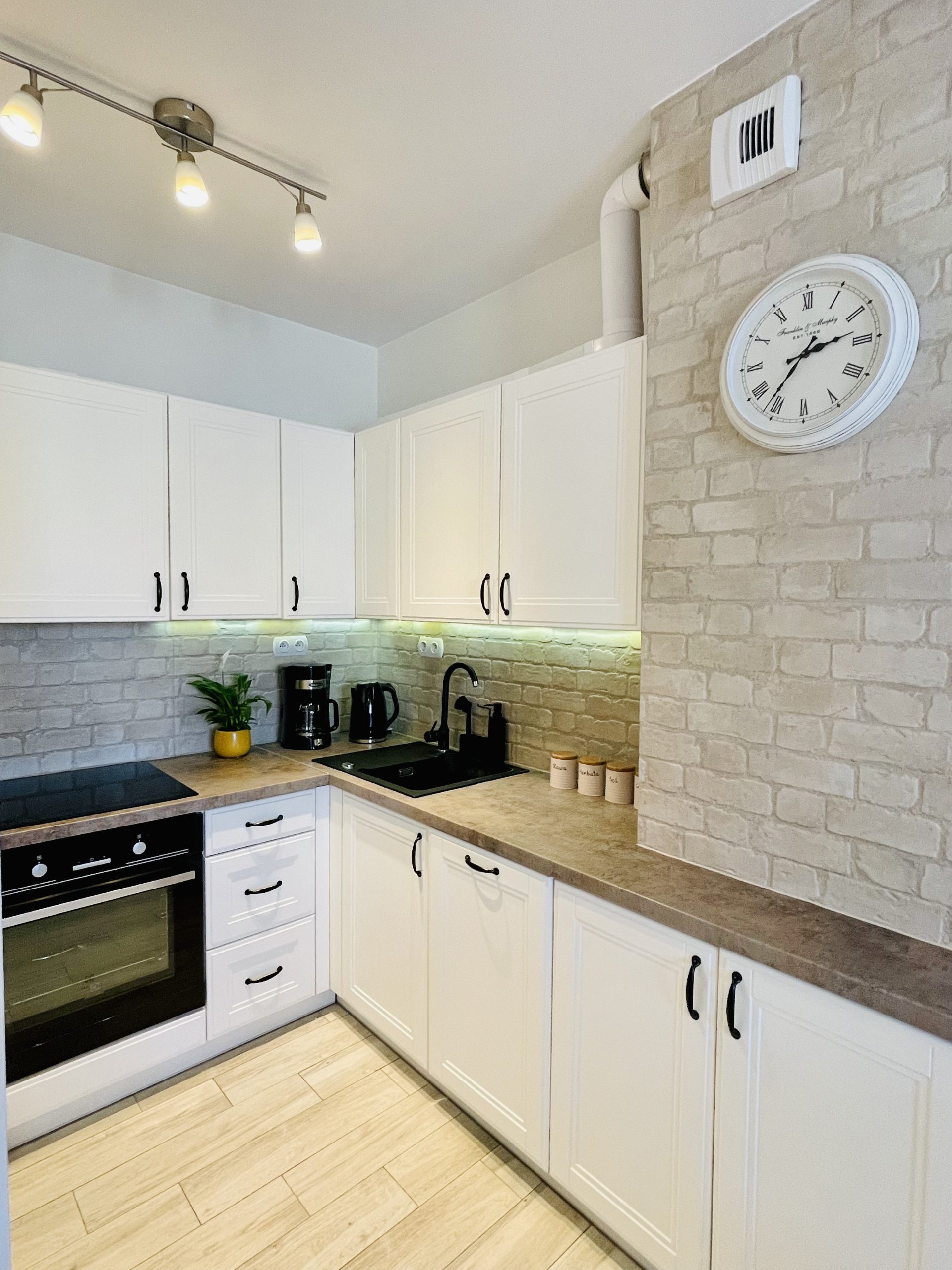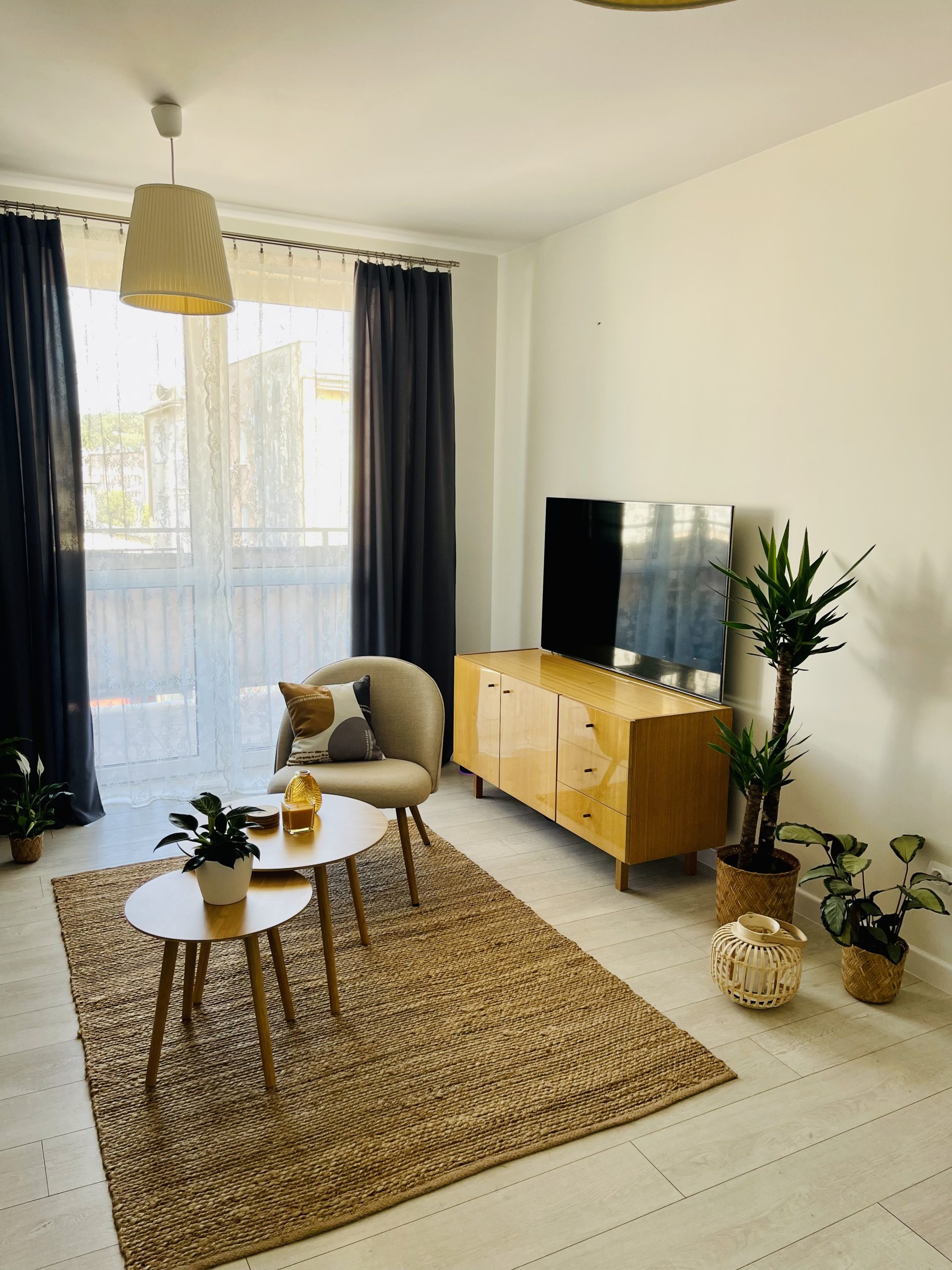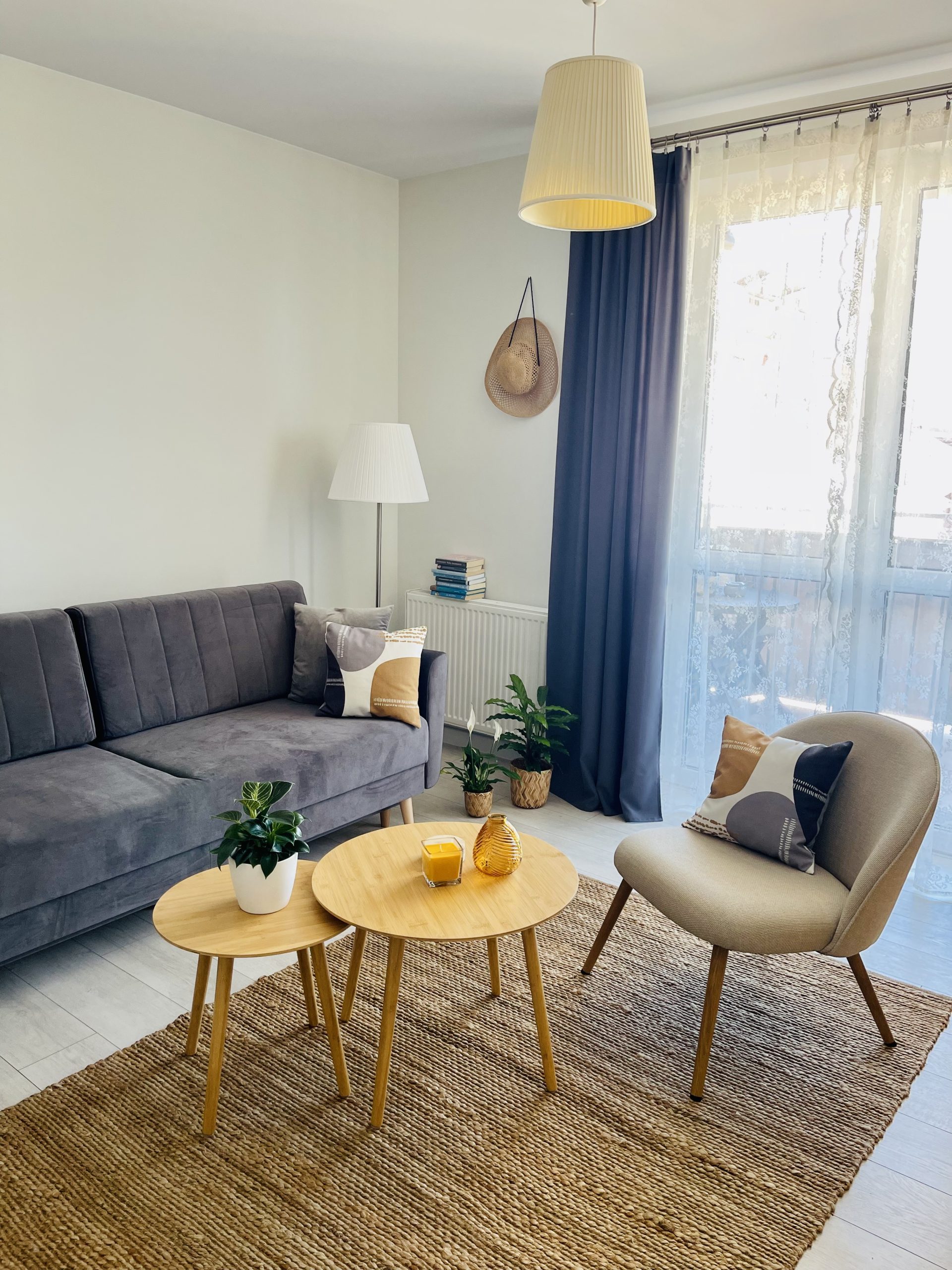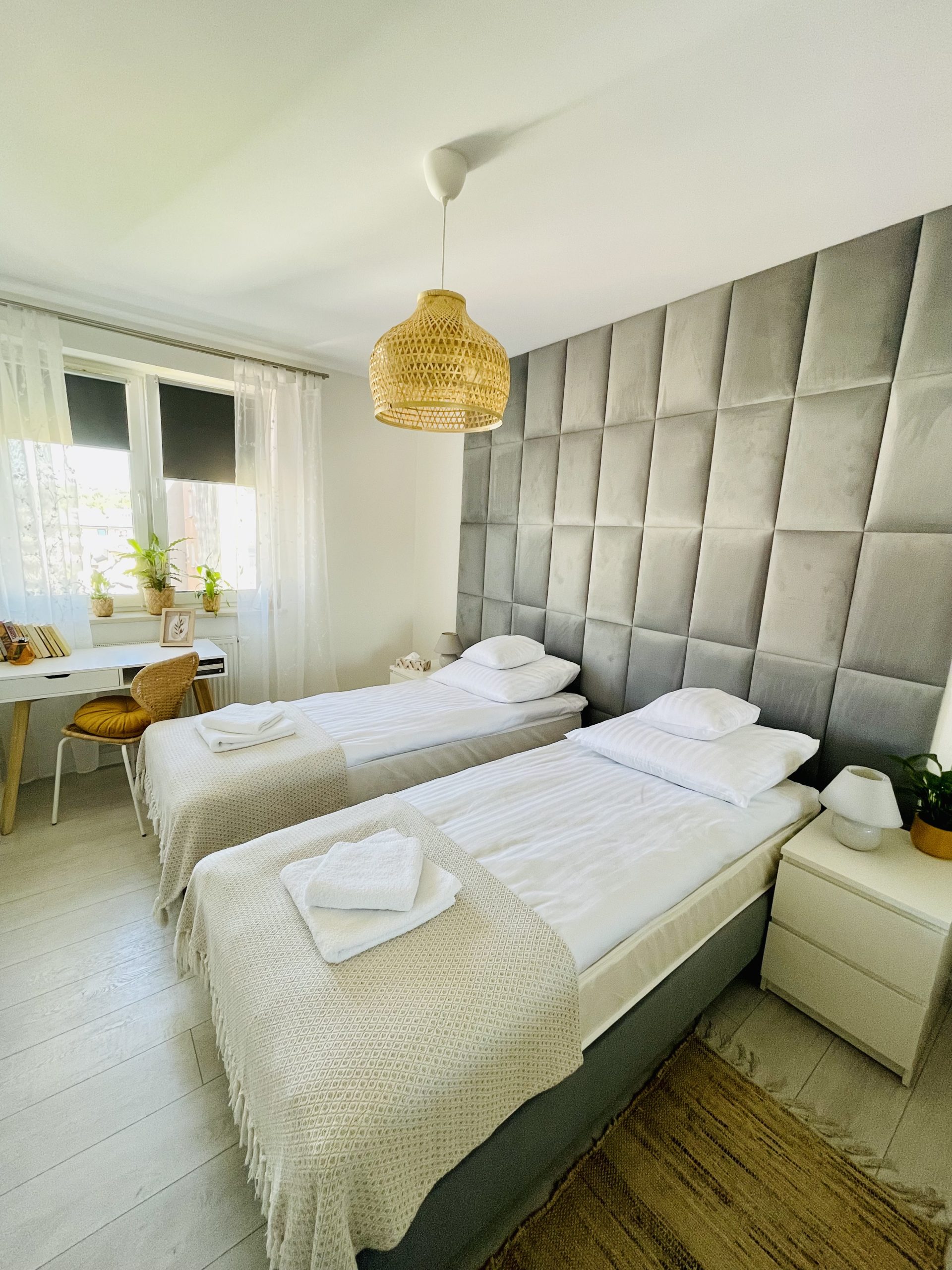 Apartament składa się z sypialni z dwoma pojedynczymi łóżkami (złączonymi w jedno duże w razie potrzeby) oraz kącikiem do pracy. W salonie znajduje się rozkładana sofa, telewizor z funkcją SMART, klimatyzacja. Aneks kuchenny wyposażony jest we wszystkie potrzebne urządzenia (płyta indukcyjna, piekarnik, lodówka, mikrofalówka, toster, czajnik, ekspres przelewowy). Do dyspozycji gości jest również balkon.